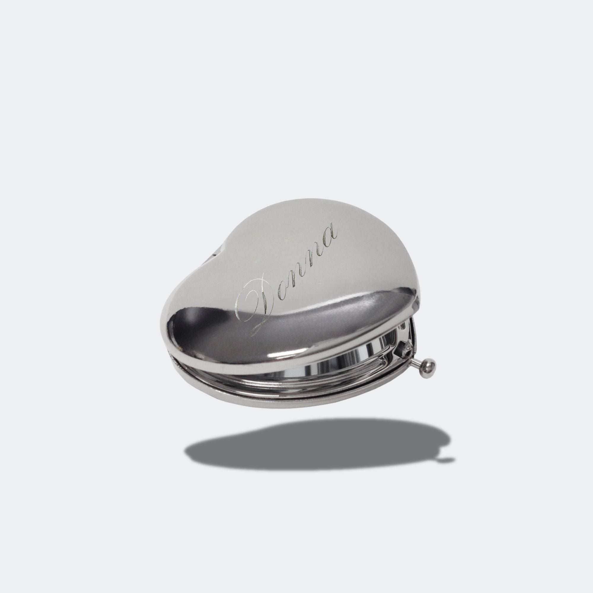 CUSTOM ENGRAVING PILLBOX MIRROR - A plated exterior and eye-catching custom name or initials, measuring 3" inch in size for pill boxes and 2" heart shape compact mirror with custom names. To ensure optimal protection while carrying, the product is provided with a pouch or soft cloth bag. Please be aware that due to its delicate design, minor scratches may be visible and returns/exchanges are not accepted. NO CRYSTALS