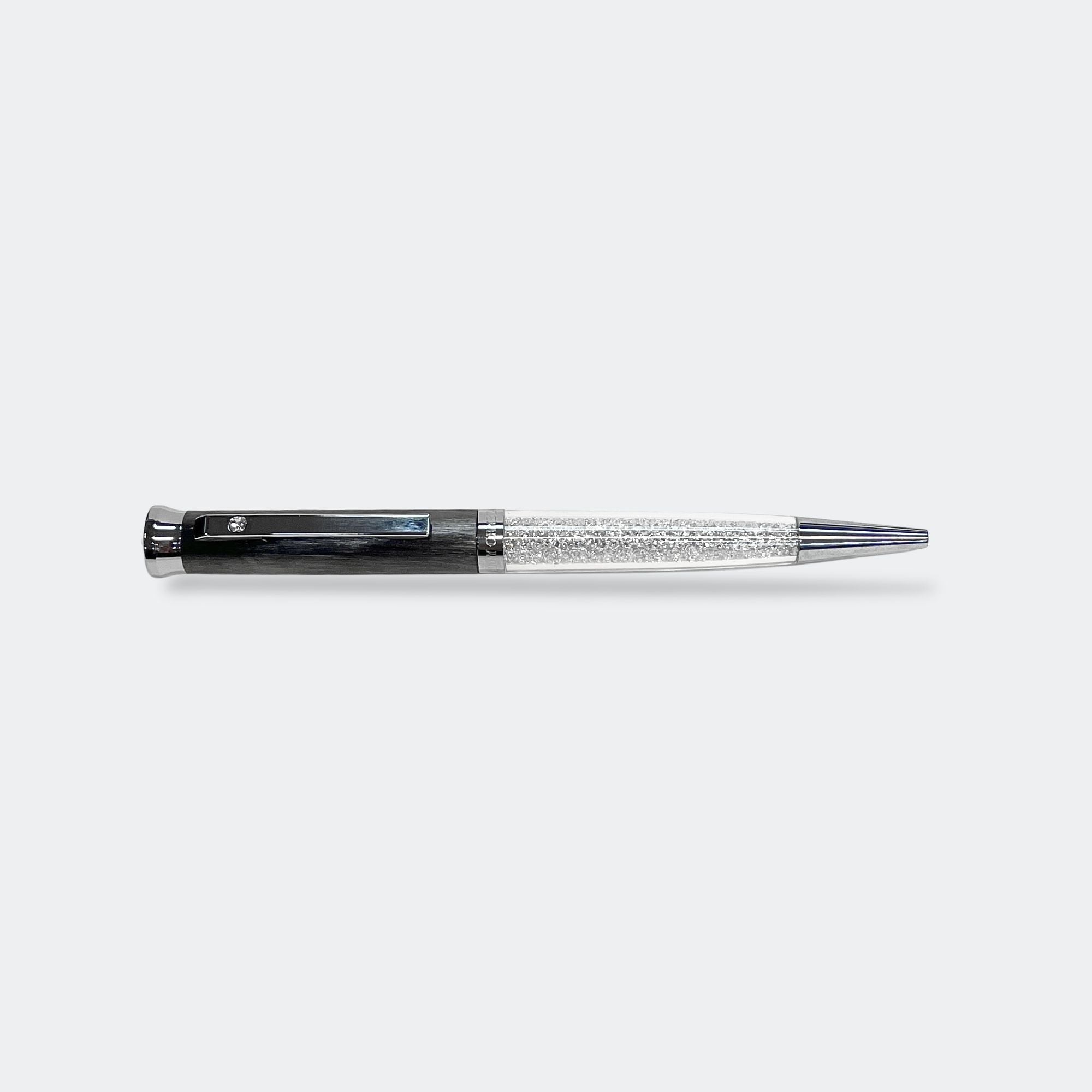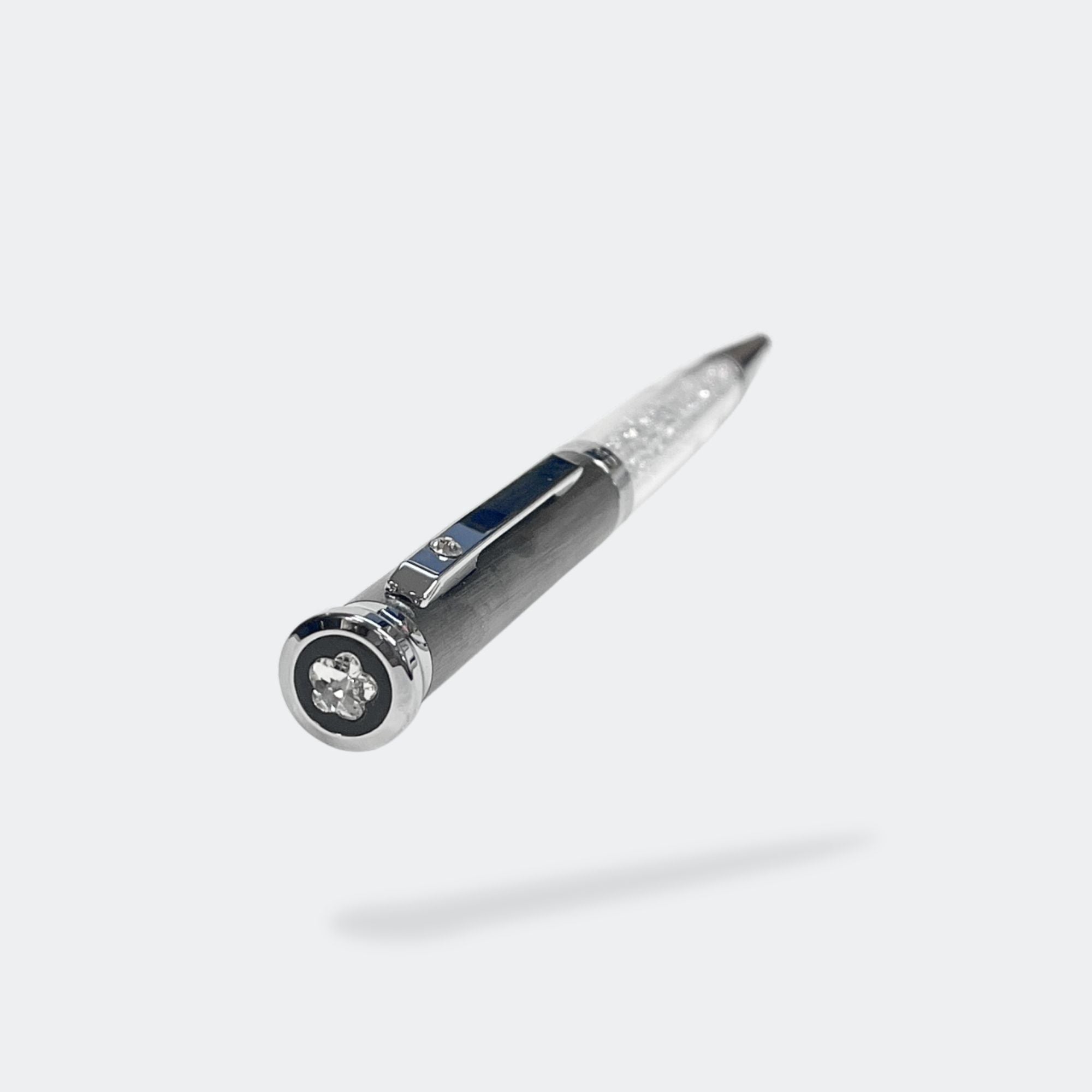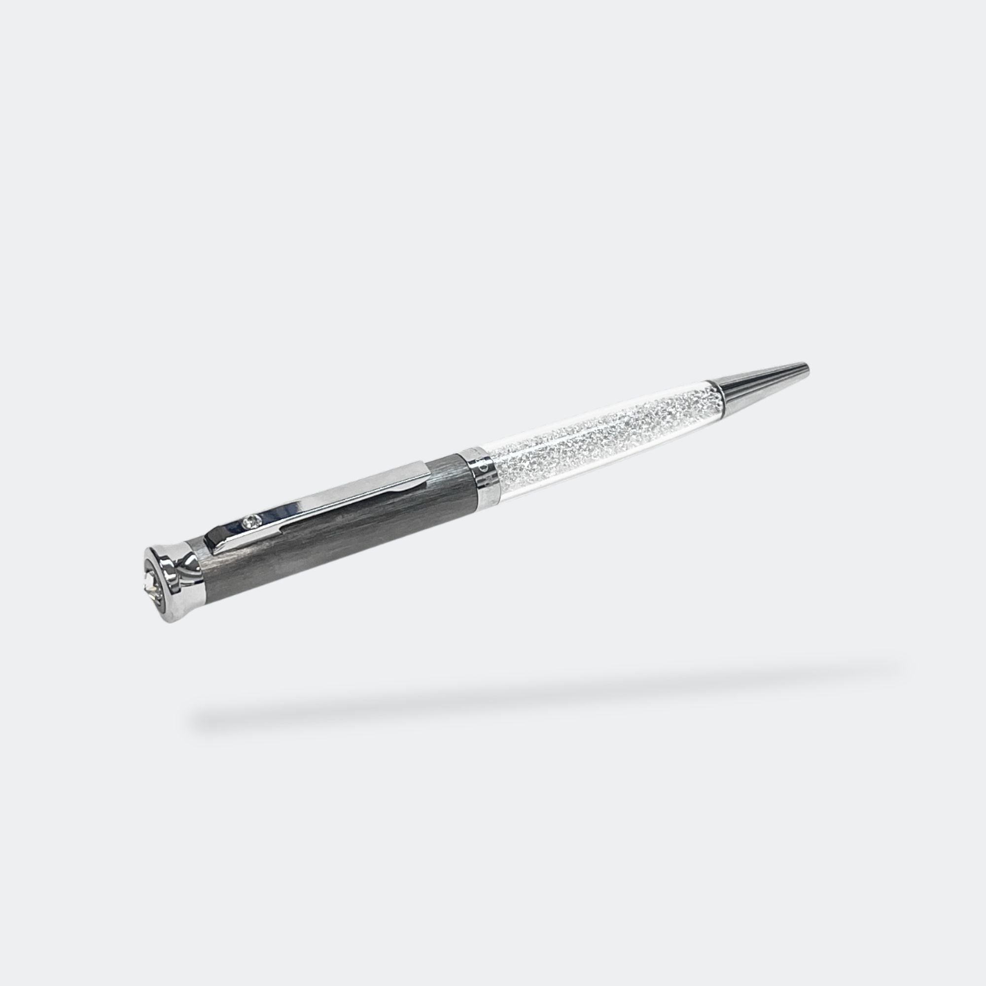 Surprise your friends and family with this perfectly subtle yet glamorous gift. Our elegant Jimmy Crystal ballpoint pens that will provide that delicate sparkle every time you write. The pen features a gun metal with fine texture and white lacquered metal barrel with chrome plating.
