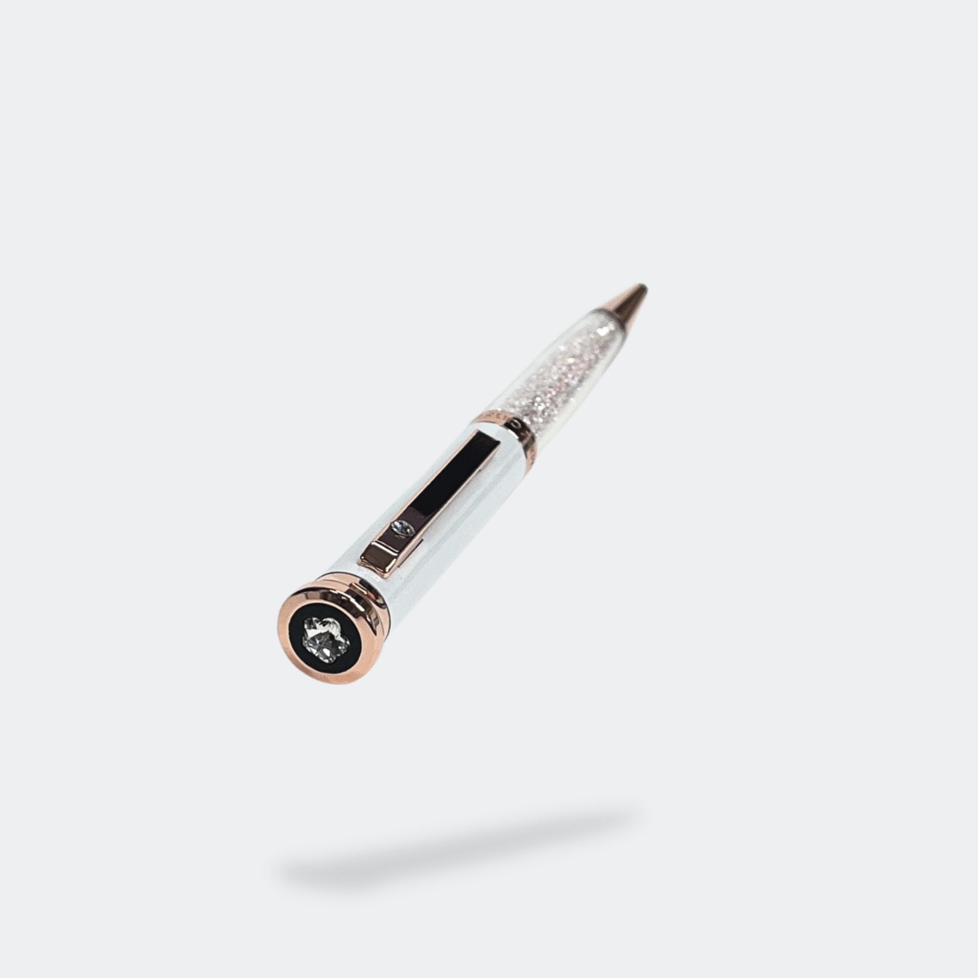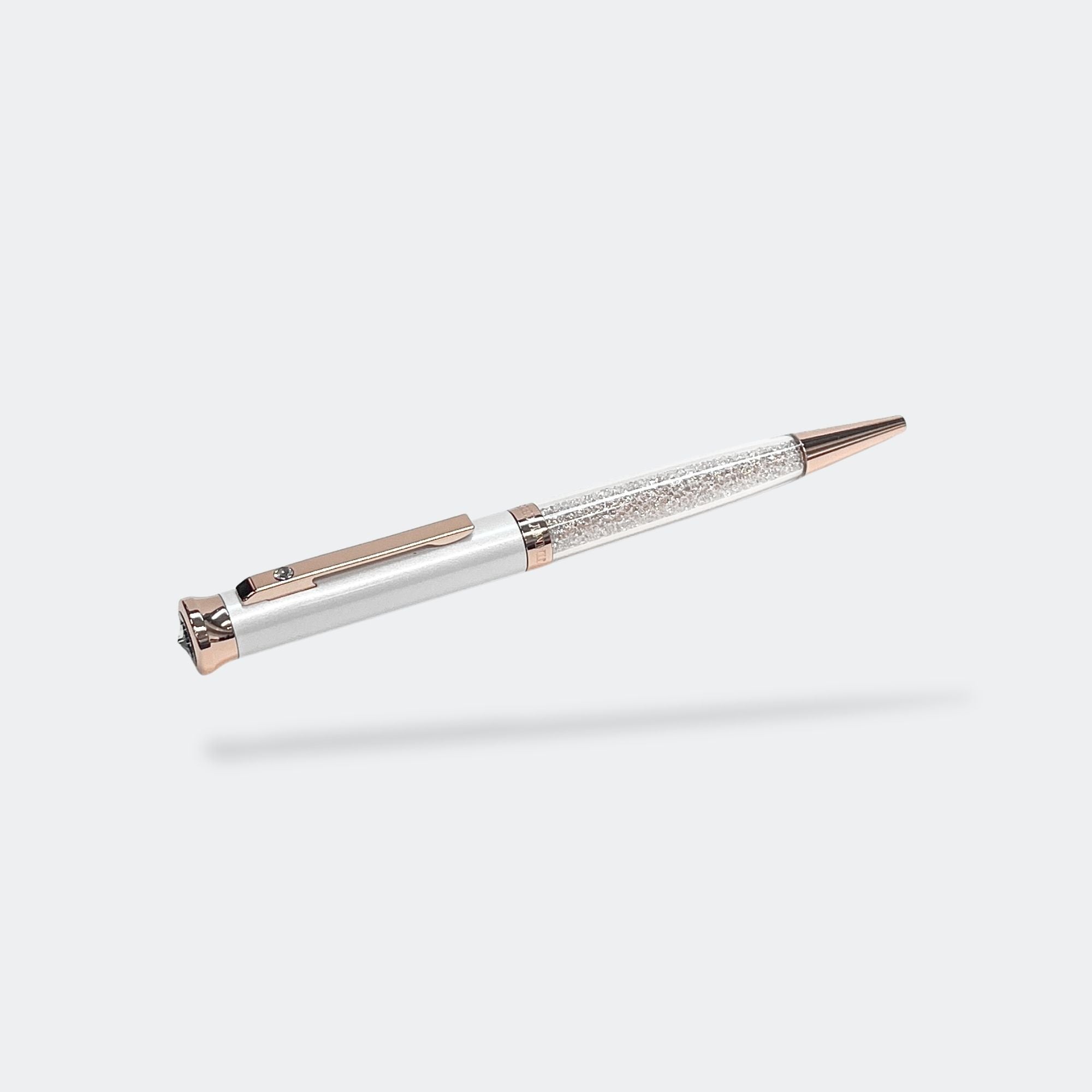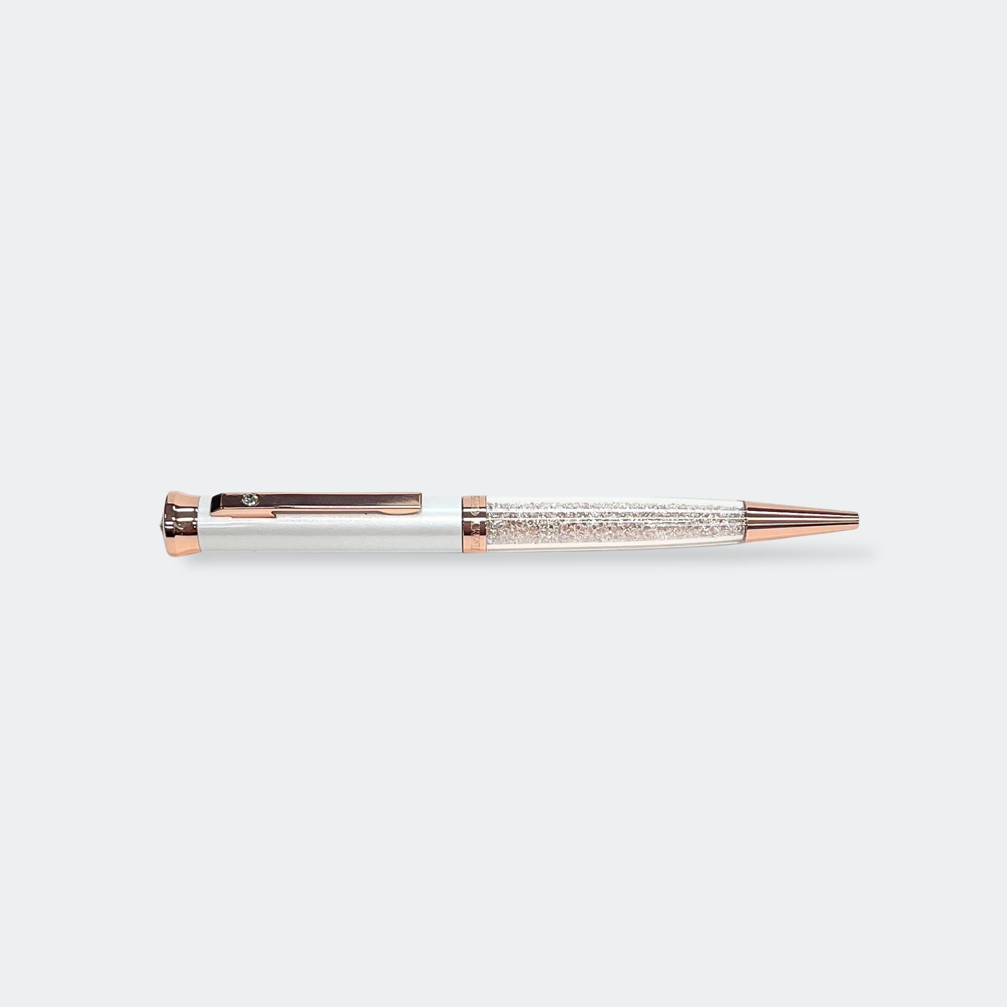 Surprise your friends and family with this perfectly subtle yet glamorous gift. Our elegant Jimmy Crystal ballpoint pens that will provide that delicate sparkle every time you write. The pen features a gun metal with fine texture and white lacquered metal barrel with chrome plating.