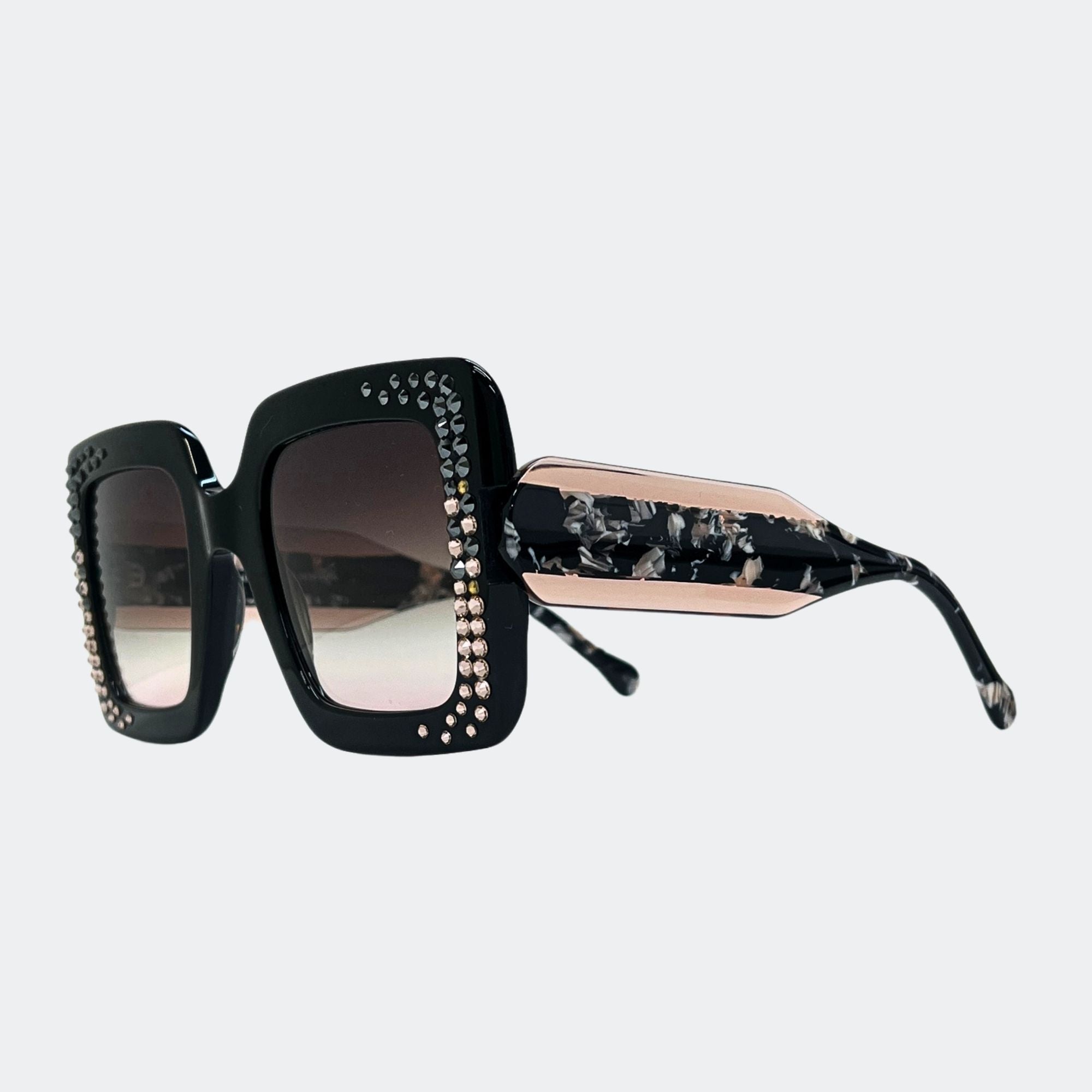 JOANNA - GL1880 OVERSIZED Crystal oversized features Austrian crystals that are expertly crafted by Jimmy Crystal. With its handmade acetate frame, this product offers both stunning aesthetics and 100% UV/UVB protection. It also comes with a purple pouch and case.