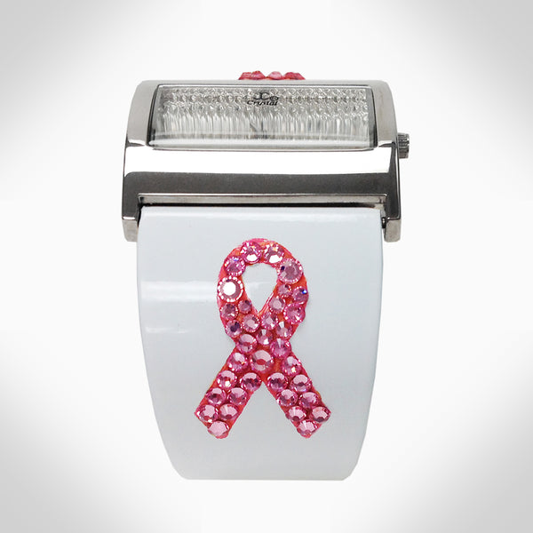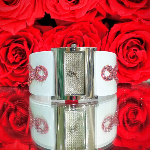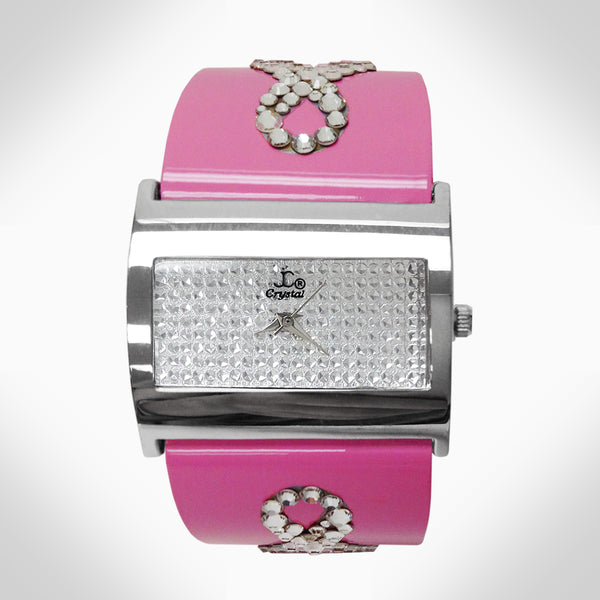 BREAST CANCER AWARENESS - WJ475 Elegant silver-tone watch featuring sparkling crystals accents on the bezel Embellished with crystals, which are set by Jimmy Crystal's expert craftsmanship. This product provides unparalleled aesthetics to transcend elegance. Stainless steel case back Miyota Japanese...