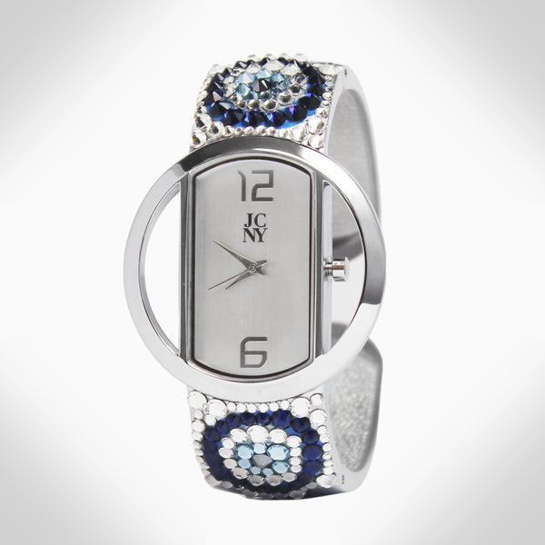 Elegant silver-tone watch featuring sparkling crystals accents on both the bezel & bangle Embellished with crystals, which are set by Jimmy Crystal's expert craftsmanship. This product provides unparalleled aesthetics to transcend elegance. JCNY logo at 12 o'clock position Mineral glass...
