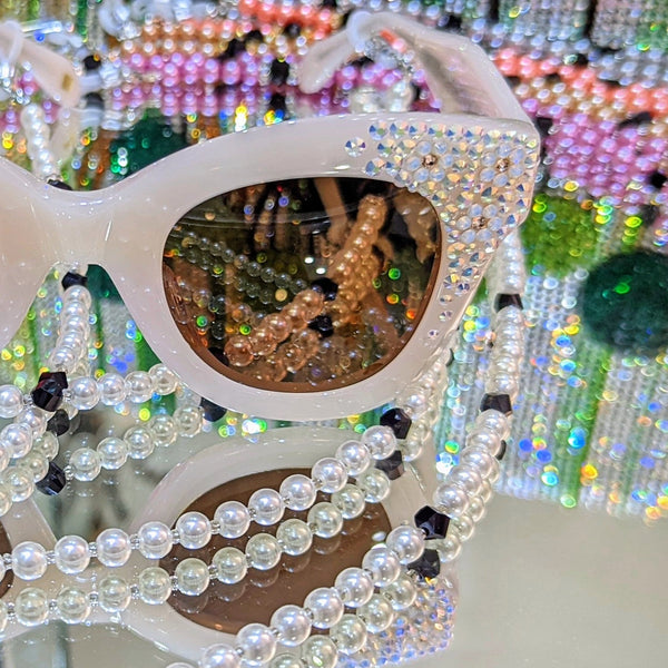 A luminous chain with pearls shimmers supremely elegant eyeglasses
