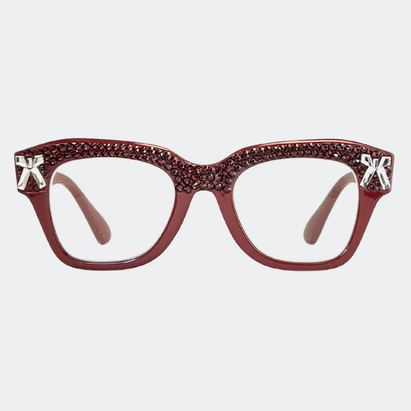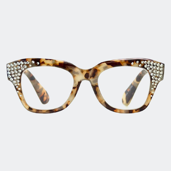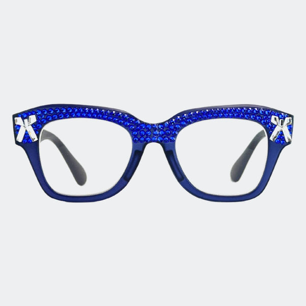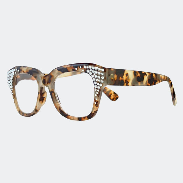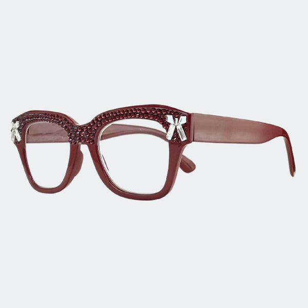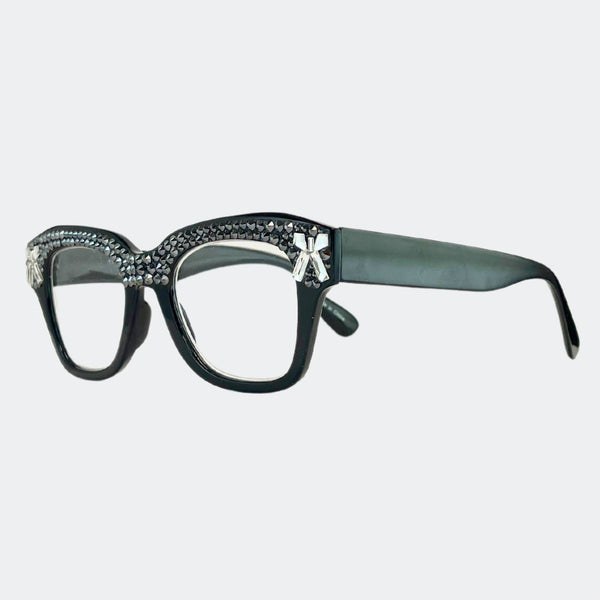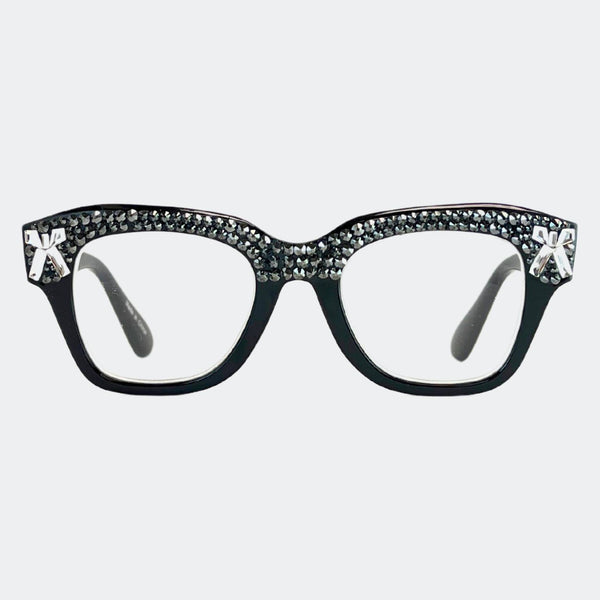 This stylish frame features hand-placed crystals, adding a touch of luxury to these lightweight, high-quality reading glasses. With a 5.5 inch width, this design exudes elegance and comes with a case and pouch for convenience.