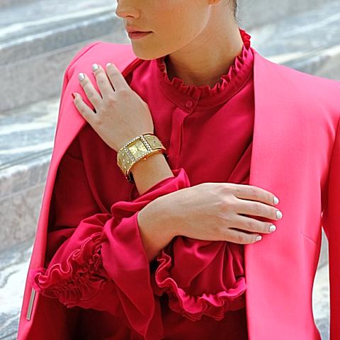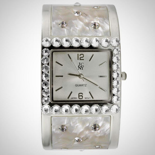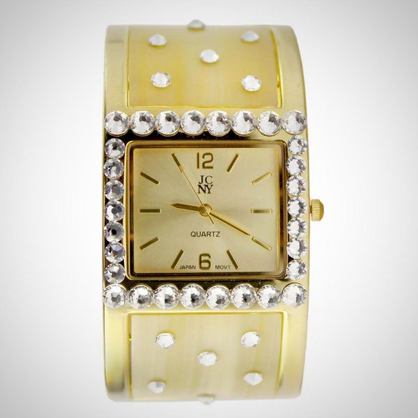 Elegant gold-tone watch featuring sparkling crystals accents on both the bezel & bangle Embellished with crystals, which are set by Jimmy Crystal's expert craftsmanship. This product provides unparalleled aesthetics to transcend elegance. Mother-of-pearl dial with JCNY logo at 12 o'clock...