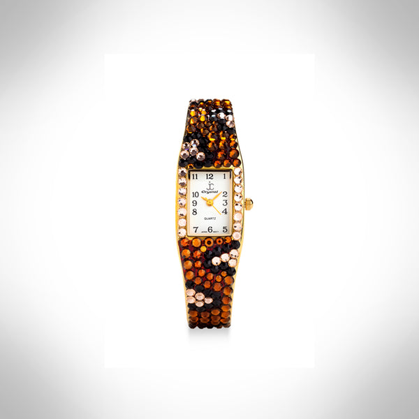 Elegant gold-tone, watch featuring sparkling crystals accents on both the bezel & bangle Embellished with crystals, which are set by Jimmy Crystal's expert craftsmanship. This product provides unparalleled aesthetics to transcend elegance. Logo at 12 o'clock position Mineral glass protects...