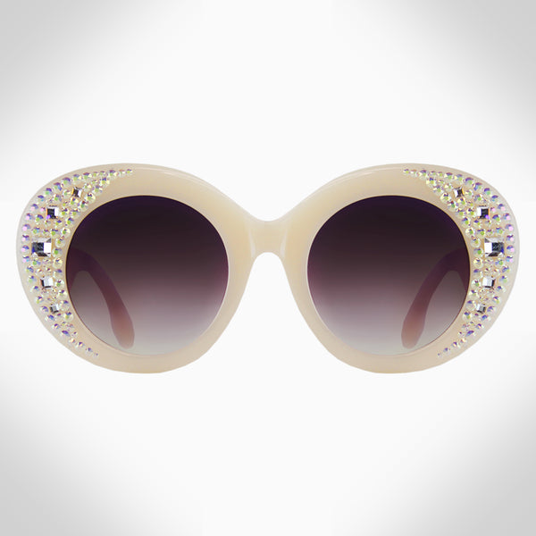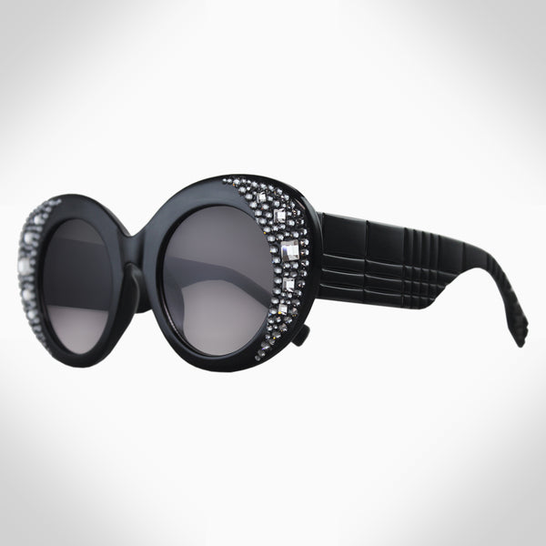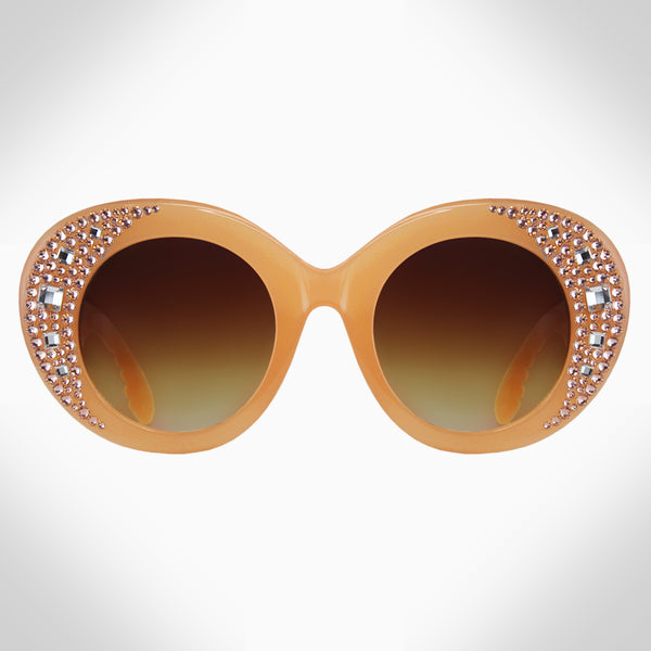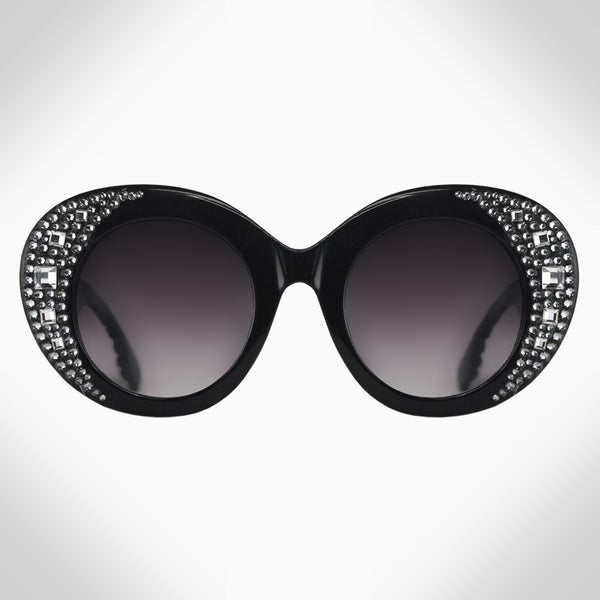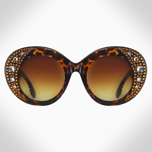 Featuring an oversized frame, the STASIA GL1749 sunglasses come with bold, round lenses and crystal embellishments on the frame, including a square crystal. Include a pouch, clean cloth, and a hard case