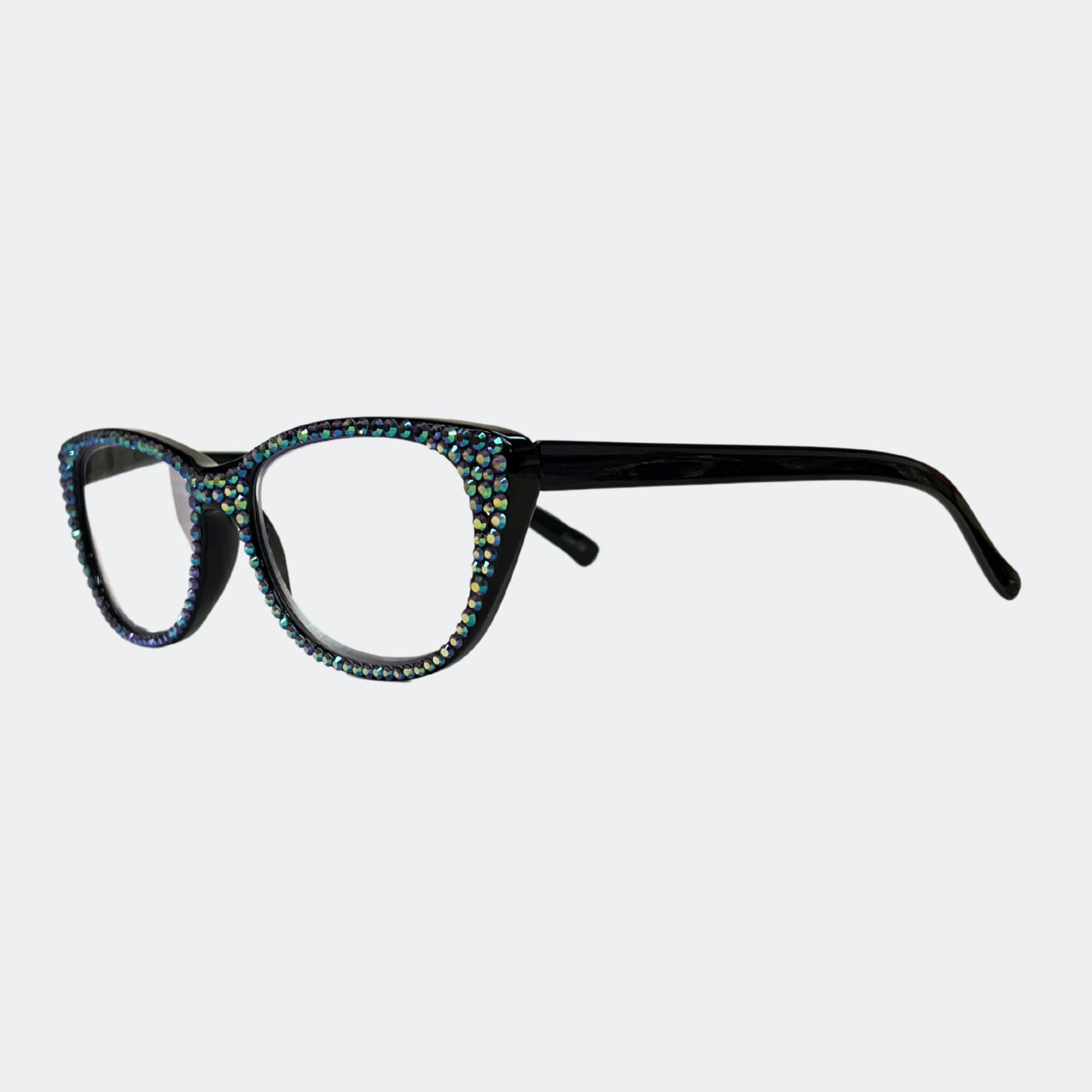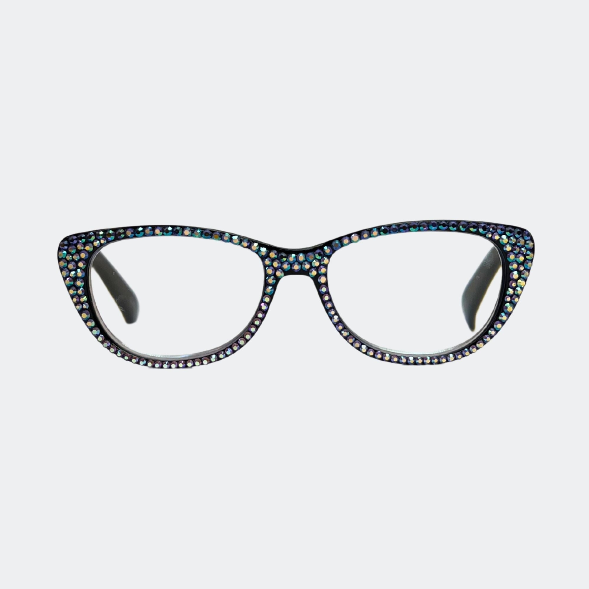 The TINA - JCR457 K.F cat-eyed reading glasses deliver a stylish injection frame embellished with intricate, hand-set crystals. A velvet lined carrying case and pouch ensure safe transport and storage, allowing you to bring this luxury design to any special event. Frame width: 5.25"