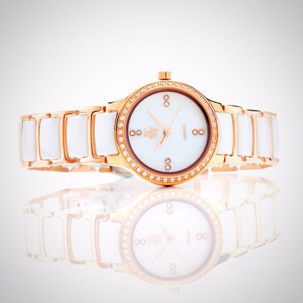 PRODUCT DETAILS Elegant rose gold tone watch featuring sparkling crystals accents on bezel Embellished with crystals, which are set by Jimmy Crystal's expert craftsmanship. This product provides unparalleled aesthetics to transcend elegance. Mother-of-pearl dial with JCNY logo at 12 o'clock...
